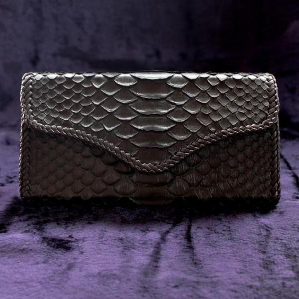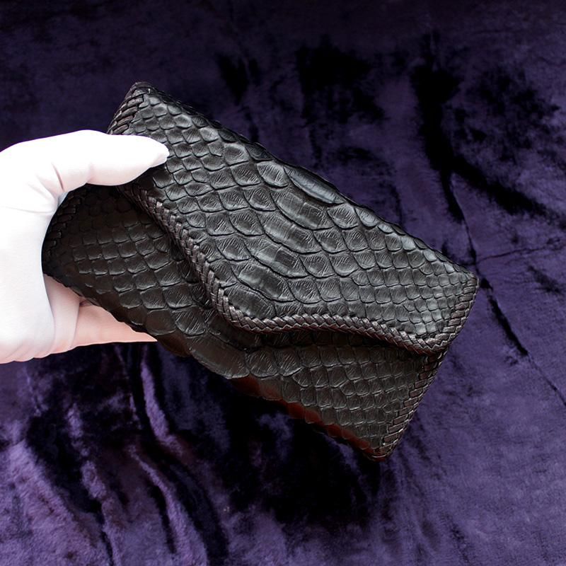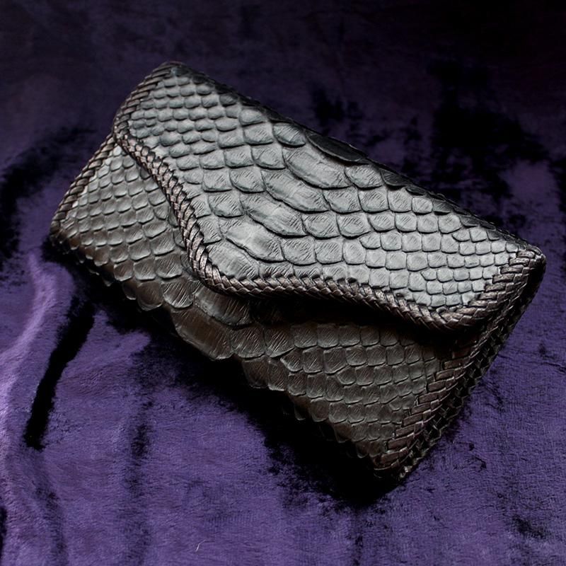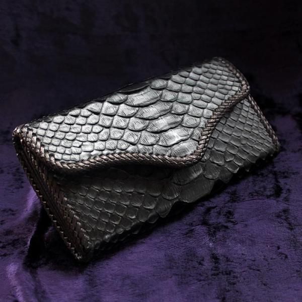 腹幅30cmの大蛇を使用したワイルドなパイソンレザー、フラップ部はブリーフカットで美しくクールに仕上げた手編み仕込み!