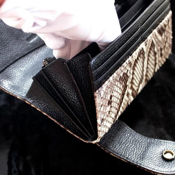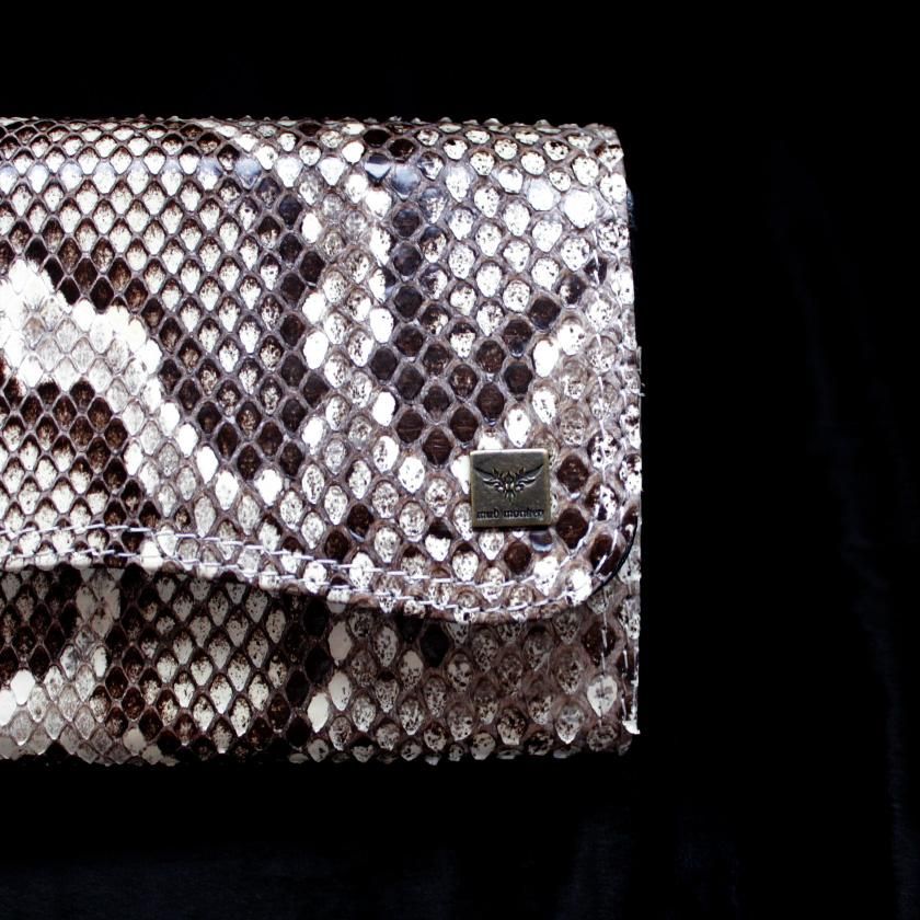 ワイルドなパイソンレザーに合わせてシボ付きのシュリンクレザーが